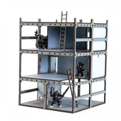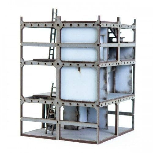 The 28mm tower block models are designed to be able to stand alone or up against one another. Their bases (all 140mm x 140mm) are designed as concrete foundations. There is a lack of exterior cladding to allow the models to stand next to one another. There are pin holes in some of the floors. Pins (not supplied) can be added to represent reinforcing bars.