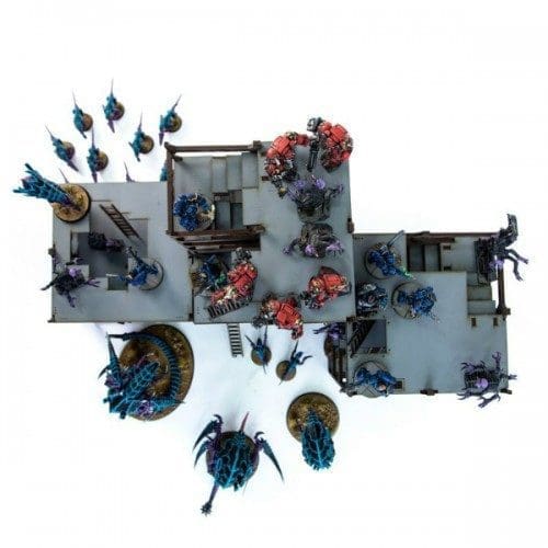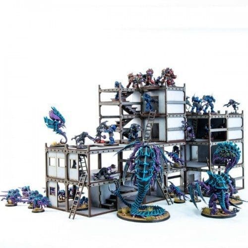 The 28mm tower block models are designed to be able to stand alone or up against one another. Their bases (all 140mm x 140mm) are designed as concrete foundations. There is a lack of exterior cladding to allow the models to stand next to one another. There are pin holes in some of the floors. Pins (not supplied) can be added to represent reinforcing bars.