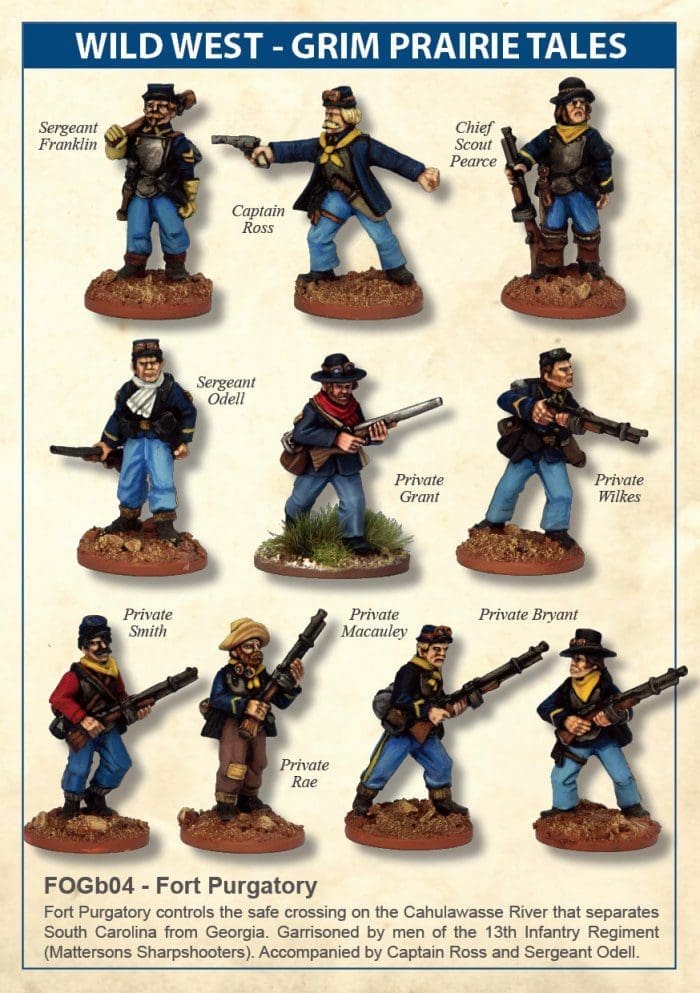 Fort Purgatory controls the safe crossing on the Cahulawasse River that separates South Carolina from Georgia. Garrisoned by men of the 13th Infantry Regiment (Mattersons Sharpshooters), they patrol deep in to South equipped with respirators and the latest Springfield Repeaters. These tough veterans have years of experience tracking down outlaws and renegades that plague the borders. They offer some protection to the few brave but foolhardy homesteaders who have moved in to the abandoned lands to start a new life, away from the packed refugee camps that surround the Northern cities.