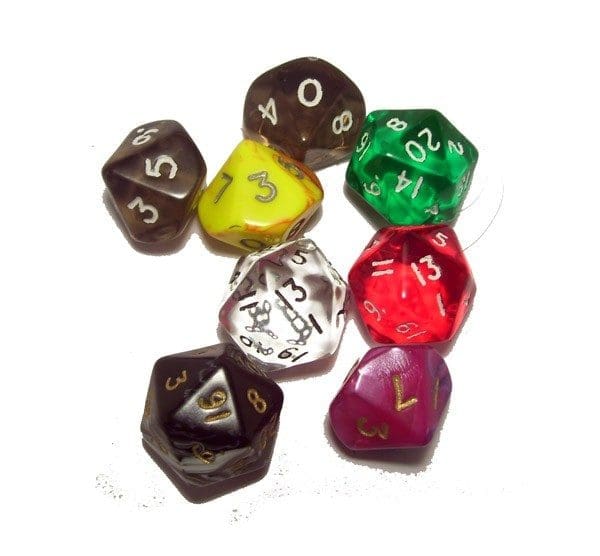 A single d10 and a single d20 for playing DMH. Colours may vary from those pictured.