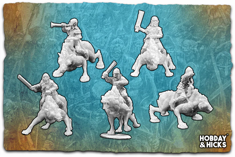 The set contains five 28mm metal miniatures, resin unarmoured wolves & 40mm round bases. Miniatures supplied unpainted and may need some assembly. All weapons and banner pole are included. Please note, you will receive a random assortment of unarmoured wolves.
