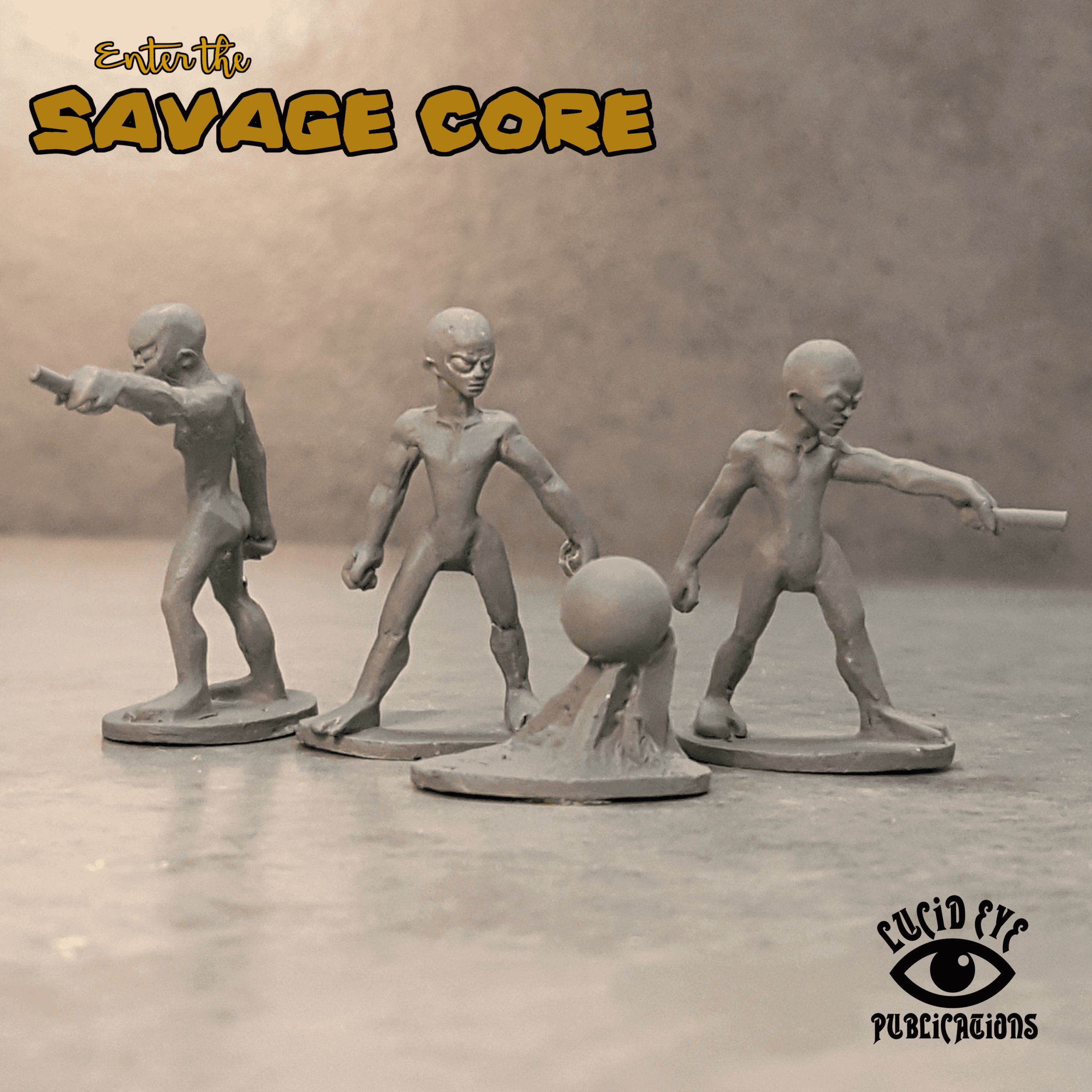 Three 28mm white metal miniatures supplied with an Id teleportation orb and three 30mm display bases.