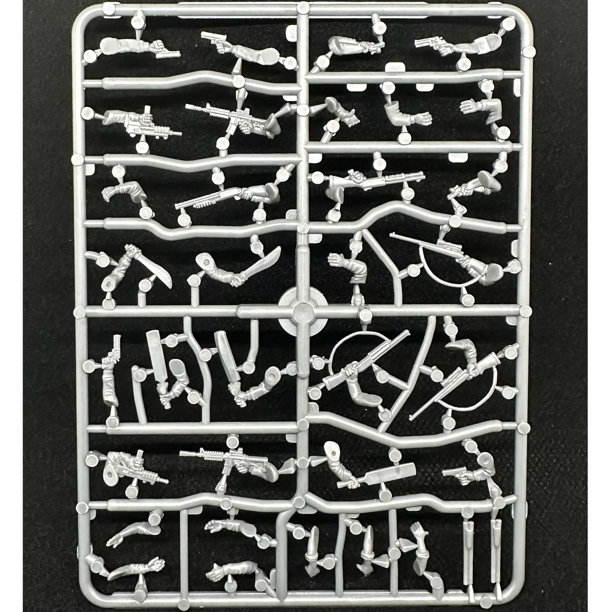 This hard plastic box set includes enough parts to build 24 28mm figures. There are six unique bodies, enough arms to make all of them fleeing, enough arms to have 1/2 the box holding signs, and a huge mix of weapon arms. Weapon arms include: broken bottles, baseball bats, cricket bats, machetes, double barreled shotguns, semi-auto shotguns, pump shotguns, AR-15s, automatic pistols and revolvers, Uzis, and hunting/sniper rifles. And to top it off there are 55 unique heads with a total of 220 heads in the box!