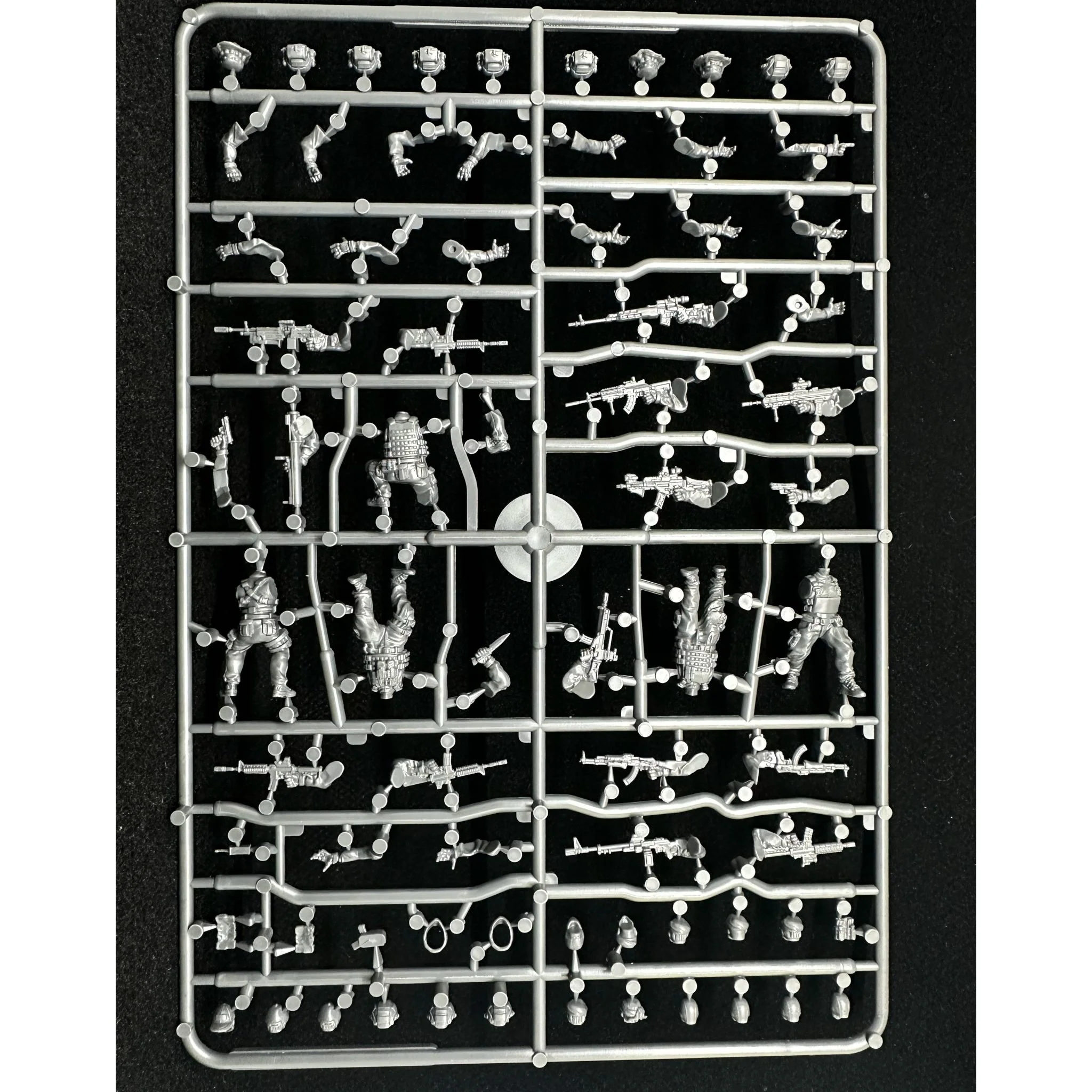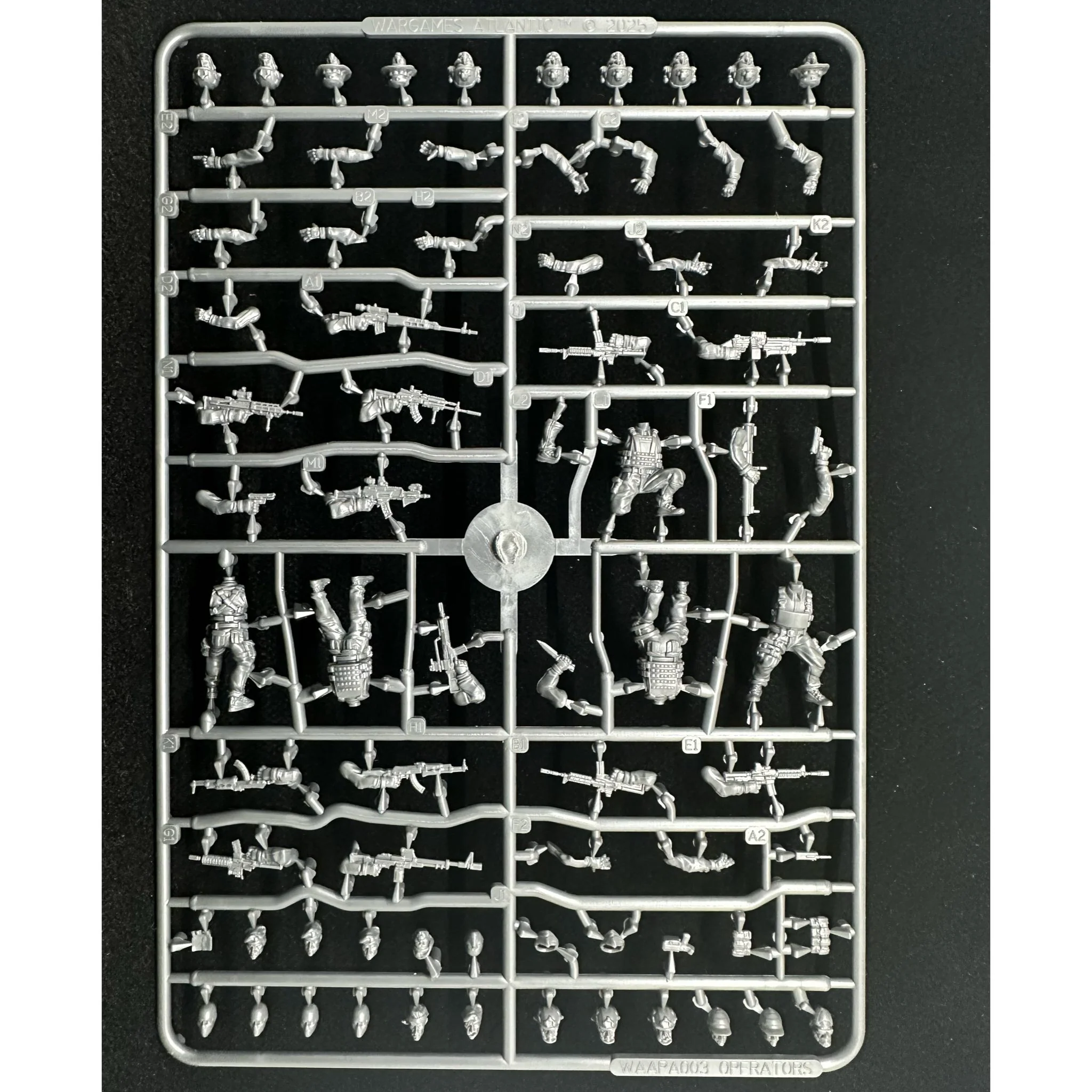 This hard plastic box set includes enough parts to build 20 28mm figures. There are five unique bodies and a mix of modern weaponry including knives, pistols, AR and M-model rifles, AK model rifles, G-model rifles, sniper rifles, light machine-guns/squad automatic rifles, and more! To top it off there are 27 unique heads with a total of 108 heads in the box!