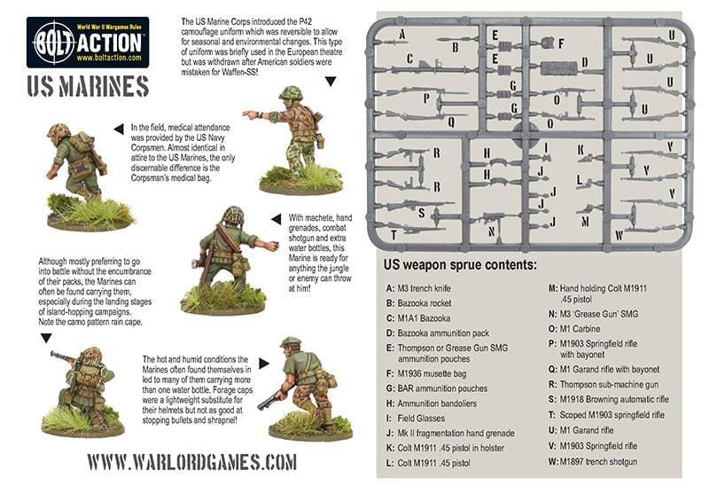 7 USMC sprues and 2 US weapon sprues – enough to make 42 infantry, incuding command models, SMGs, shotguns, BARs, bazookas and scoped rifles for sniper teams