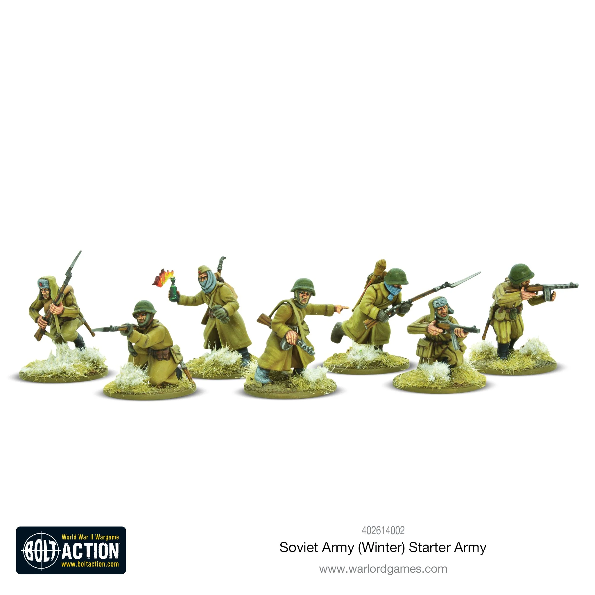 This starter army for Bolt Action contains enough troops to make a sizeable starter army for the defence of the Motherland in the bitter winter that beset the Eastern Front. The bitter fighting in Finland had taught some hard lessons to the Red Army where thousands of their men fell victim to frostbite. The cold weather kit later issued was warm and comfortable, frequently padded or quilted, and was much envied by the German troops shivering in thin overcoats.