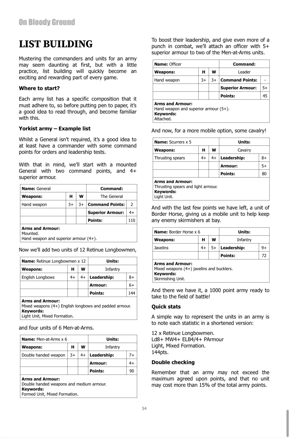 On Bloody Ground – The Wars of the Roses, includes five complete army lists to enable players to build The Yorkists, The Lancastrians, Richard III, Henry Tudor or The Yorkist Pretenders armies.